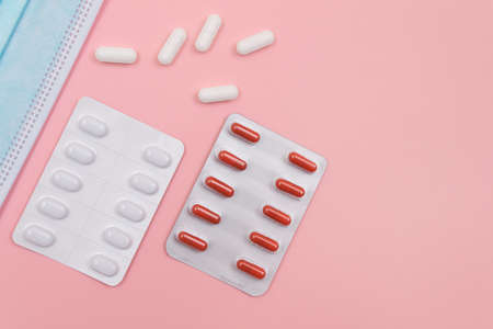 COVID-19 medicine, medicine for COVID-19, Capsule medicine, capsules pills,various capsule on a pink background