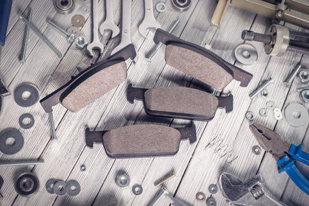 New car brake pads on a white wooden background. Studio photo with vignetting.