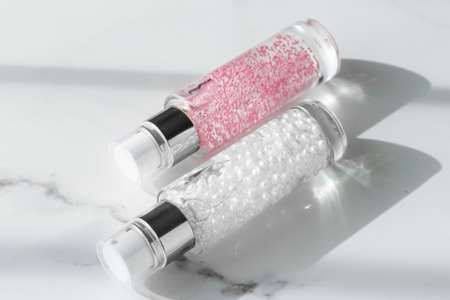 Cosmetic branding, packaging and make-up concept - Skin care serum and gel bottle, moisturizing lotion and lifting cream emulsion on marble, anti-age cosmetics for luxury beauty skincare brand design