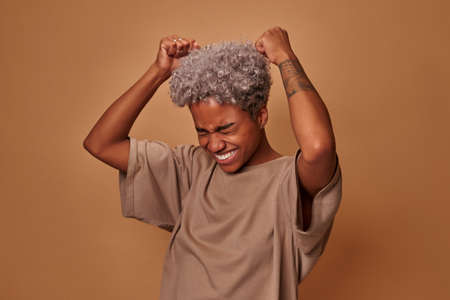 African woman rejoices praises or winning competition, makes fist pump