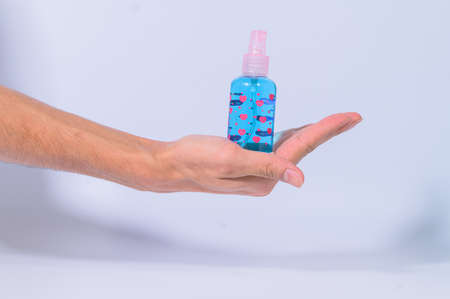 A blue antiseptic with a spray of sperm solution is located in human hands on a white matte background.