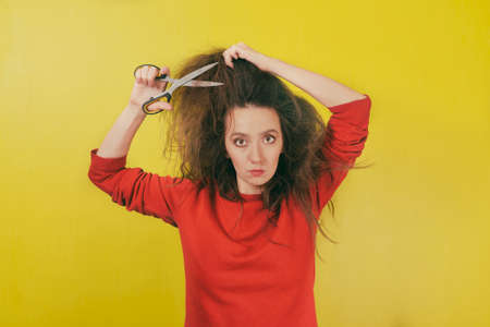 portrait of woman long hair and looking unhappy. Messy hair. Brunette woman with messed hairs. Girl having a bad hair. Bad hairs day.