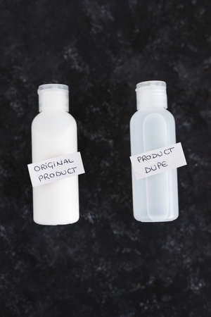 concept of imitations and unfair competition, couple of body lotion bottles with Original vs Dupe product labels