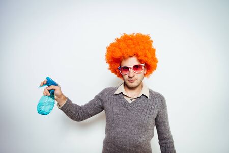 guy in a wig with a cleaner for windows