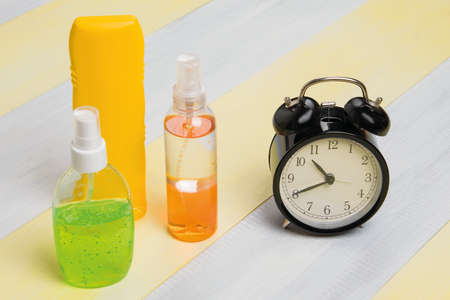 clock and sun protection on gray-yellow wooden background