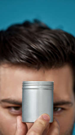 Closeup shot of brunette man looking at camera, holding silver jar with gel or cream hair styling product over his face isolated over blue background