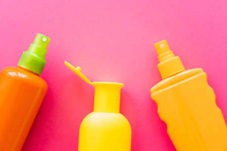 Top view of sunscreens on pink surface