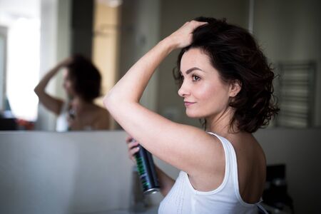 Beautiful young woman styling her her in her bathroom, in the morning
