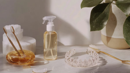 A serene and elegant setup of skincare products showcasing a spray bottle, oil, and grooming accessories, complemented by natural greenery in a minimal context.