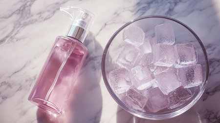 A vibrant pink spray bottle rests beside a bowl of sparkling ice cubes on a sleek marble surface, capturing a refreshing summer aesthetic for skincare lovers.