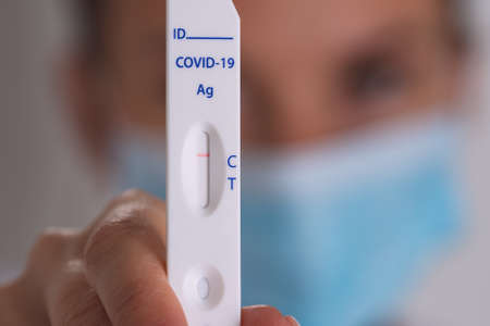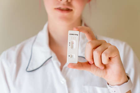 Doctor holding positive ( rapid antigen SARS-CoV-2 Ag ) test.