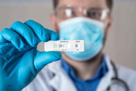 doctor hand with rapid test for coronavirus, blue background