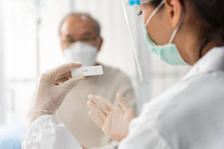 Asian senior male consult with doctor after know the result from ATK. Elderly old man patient talk to specialist practitioner after use ATK rapid test