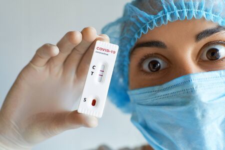Doctor containing a COVID-19 2019-nCoV viral disease test kit. Sars-cov-2 viral coronavirus virus virus tested lab card kit