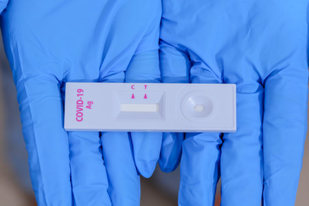 Doctor in protective vinyl gloves holding Covid 19 Ag test.