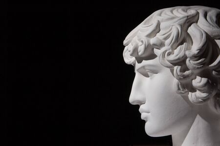 Gypsum copy of ancient statue Apollo head isolated on black background. Plaster sculpture man face.