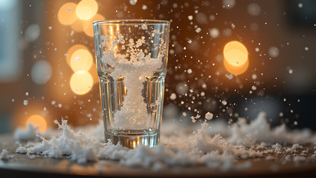 A clear glass is filled with snow, and more snow is scattered around it. The background is blurred, with soft, warm lights adding a festive touch.
