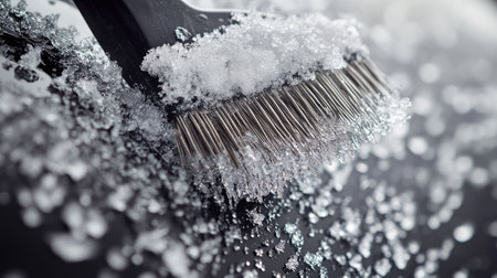 Close-up of a snow brush clearing frost and snow from a car windshield, with detailed snowflakes clinging to the bristles