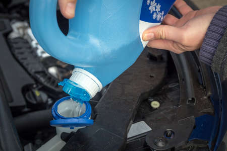 driver refilling the blue non-freezing windshield washer liquid in the tank of the car, closeup