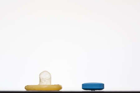 Blue pill and a condom on a white background; concept of using a medicine to solve a problem such as male erectile dysfunction