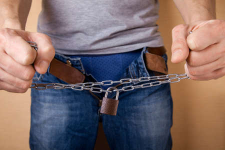 No sex. Prohibition of abstinence of sexual relations. Man holds chain with lock in the groin area