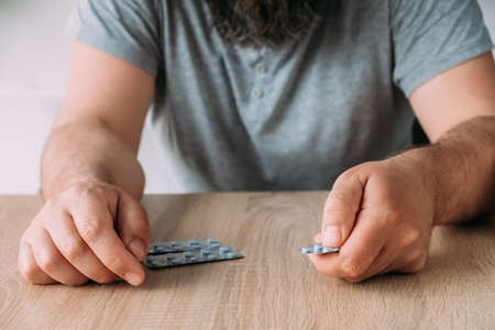 Close-up of a man with a beard takes out pills from the package on the table. Holds a package in his hand