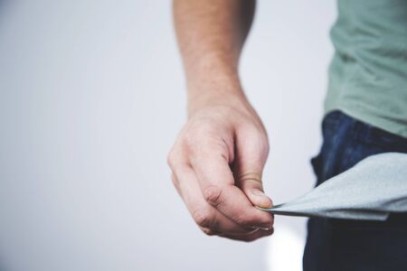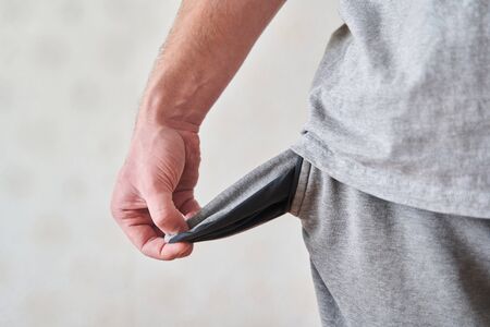 No money in pants pocket. Close up man holding his empty pants pocket to show no money inside. Financial concept. Studio shot