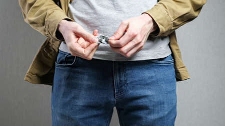 Itchy or Tinea Cruris concept. Man use hand scratching under his pant studio shot on grey background