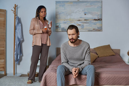 african american woman holding pills and glass of water, looking at stressed man, abortion concept