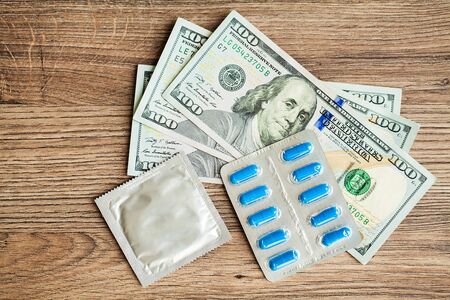 Medical potency pills and condom on jeans.