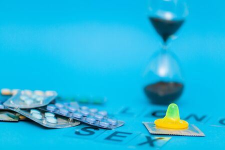 contraceptives. Condoms and birth control pills on blue background.