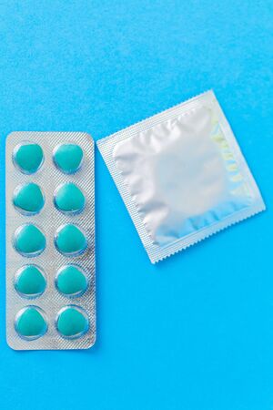 Birth control pills and condom in package on blue background. The concept of choosing method of contraception, birth control pills or condom. Copy space for text.