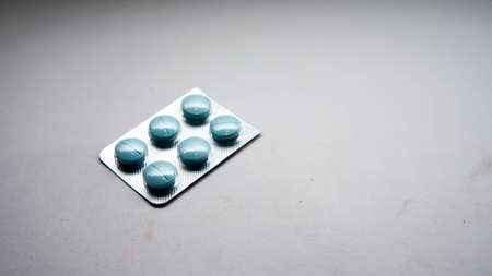 Blister package with Vitamin on color background. Medicine pills on a light background. Medicines and prescription pills flat lay background. blue medical tablets in blister.