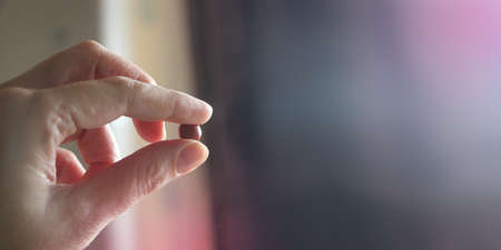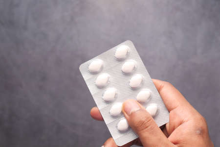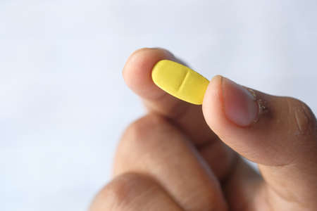 Male hand holding drug or vitamin pill in
