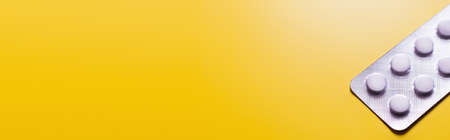 top view of blister pack with capsule isolated on yellow, banner