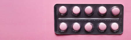 top view of blister pack with pills isolated on pink, banner