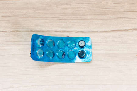 top view of pills of blister pack on blue background