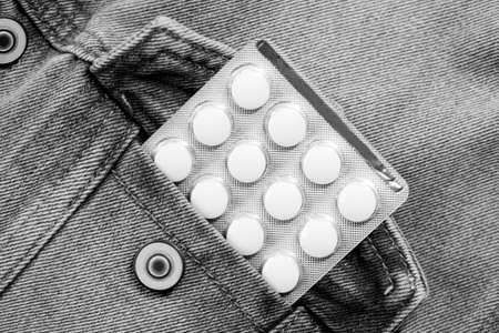 Medical pills in a blister pack on jeans. Black and white photo.