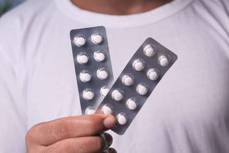 man in white shirt hand holding blister pack