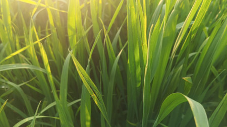 Close-up view of vibrant green grass blades bathed in sunlight. A serene and peaceful image of nature's beauty