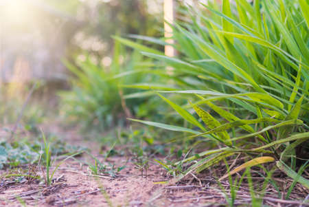 close up dirt path along the clump of grass with sunlight and blurry and select focus