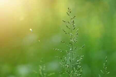 Green grass in morning sunshine. Ecology concept. Nature view landscape.