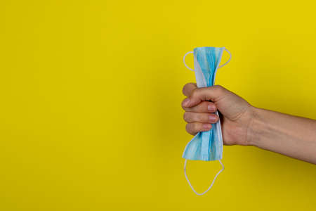 A young woman holds a medical face mask in her hand. Girl with anger grips the mask in her hand. Copy space for text or design. Protective mask on a yellow background. Health care concept