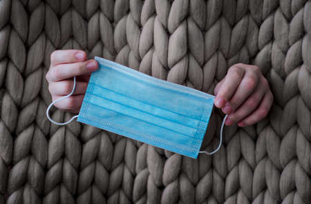 Medical mask in hands on knitted background. pandemic in cold season. Health.