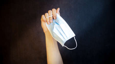 Man holding a protective face mask by the elastic straps conceptual of infection control during the pandemic