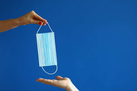 Hands with manicure transfer a protective medical mask to other hands. Virus protection concept