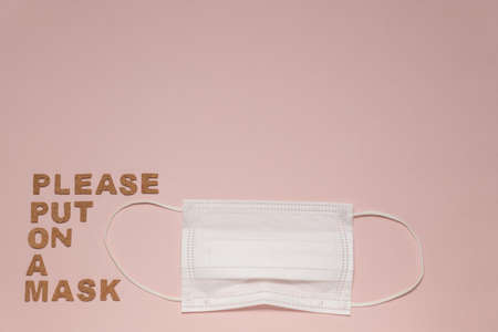 Background concept for news about the novel coronavirus COVID-19 pandemic, antiviral medical mask for protection against coronavirus. Surgical protective mask. Medical respiratory bandage face and thermometer, lettering on copy space.