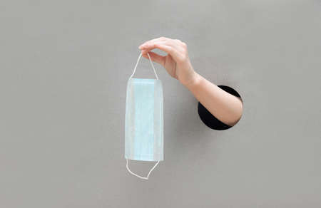 A female hand holds a medical mask on a gray background. Hand in a paper hole. Prevention of coronavirus, covid-19. Healthcare concept.