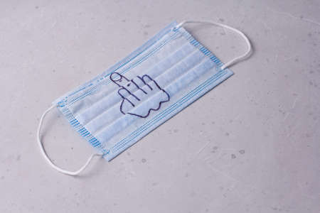 New Normal fashion Blue surgical or medical mask with red lipstick marks on it. Used dirty face masks with cosmetic lipstick. Spread of germs, virus or bacteria. Problem of unhygienic disposal of infectious waste