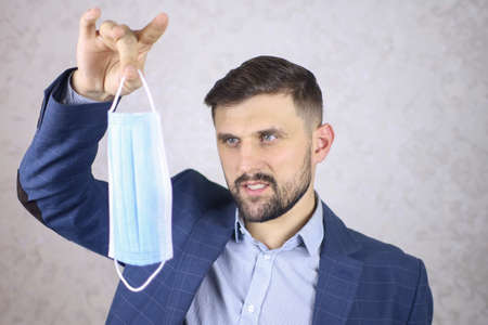 A man in a gray T-shirt is holding a medical mask in front of him. Place for text. Copy Space. COVID-19